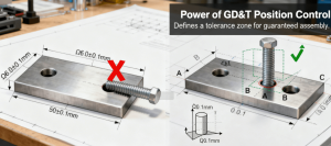 Figure2: Why ± isn’t enough: This direct comparison shows how GD&T’s position tolerance creates a cylindrical zone that guarantees part functionality, while linear tolerances alone can lead to assembly failures even when dimensions are “in spec.”