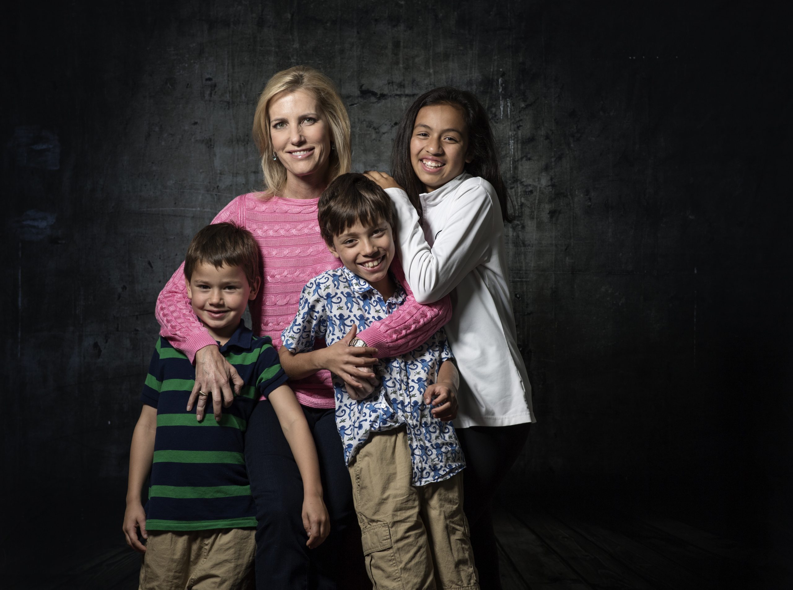 Conservative talk radio host Laura Ingraham is getting her first prime time news show on FOX. She is photographed in McLean, Virginia on October 14, 2017. PICTURED, from left to right, Nikolai, 7, Laura Ingraham , Dmitri, 9, Maria, 12